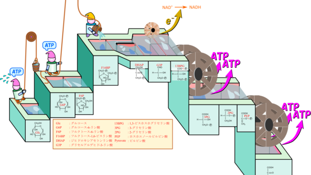 解糖系(glycolysis)によって糖からエネルギーを取り出しATP を生成する