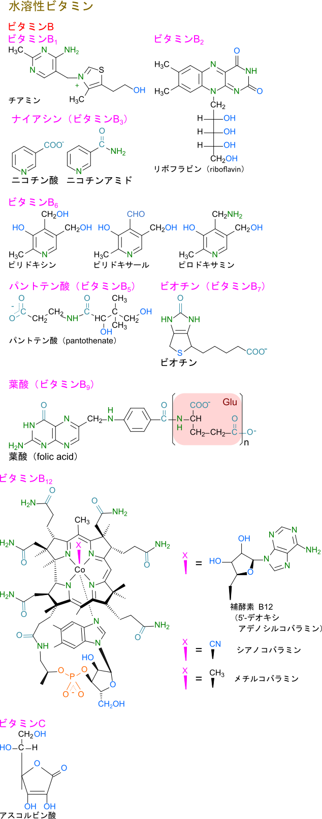 | B12 | コバラミン | メチル基転移反応の補酵素 |