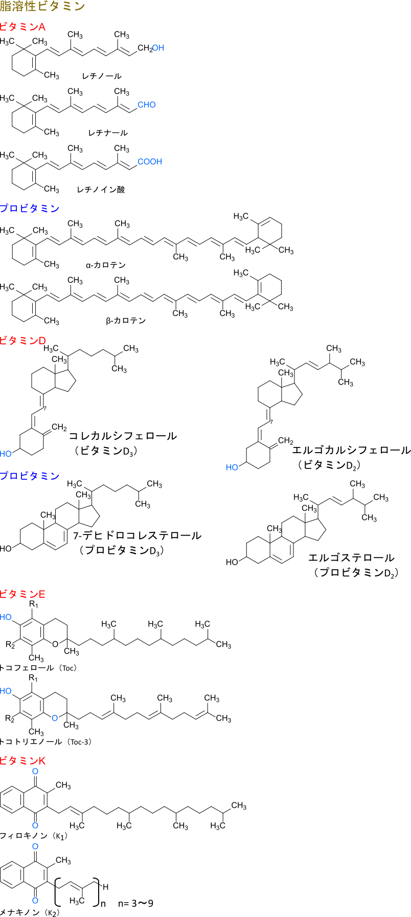 | A | レチノール レチナール レチノイン酸 | 成長促進 視覚の正常化 上皮細胞の正常化 生殖機能の維持 子宮内膜、卵子、精子の正常な機能 感染予防 血管の強化、気管支の粘膜正常化、免疫細胞の機能維持 |