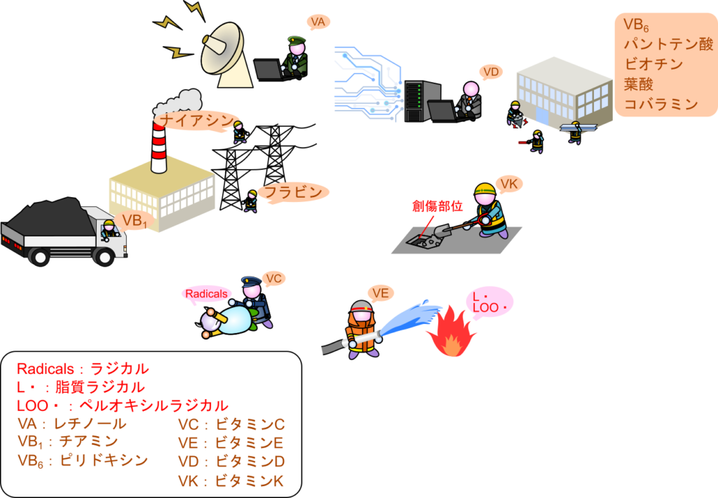 ビタミンには様々な物質が含まれ、実に多様な機能を果たしています。例えばビタミンAはレーダーやセンサーに相当する視覚にかかわるビタミンです。ビタミンB群には様々な補酵素が含まれます。例えば、ビタミン B1 やフラビン、ナイアシン、パントテン酸などは発電所のようにエネルギーを生み出すTCA回路や酸化的リン酸化に関与する補酵素であり、ビタミンB6、パントテン酸、ビオチン、葉酸、コバラミンなどは脂質合成やメチル基転移反応など細胞を構成する物質の生合成にかかわる工事作業員のような補酵素です。血清 Ca2+は神経のシグナル伝達などに深く関与する重要な因子です。 血清Ca2+濃度を適正に保つ役割はビタミンDが担っており、これは情報伝達を適正に制御するサーバー管理者のような役割にあたります。体内では活性酸素や脂質ラジカルのように生体を傷つけてしまう分子が生成されることがあります。ビタミンCやビタミンEは警察官や消防士のように、これらの物質が引き起こす危険な反応を止める役割を担っています。血管は体内の物流を担う道路のような役割を担っています。これらの血管が破れたような創傷部位では血小板や血液中のフィブリンなどの作用により傷口をふさぎます。この作用は道路の破損個所を修繕するような役割に相当し、この作用に関与するビタミンがビタミンKです。