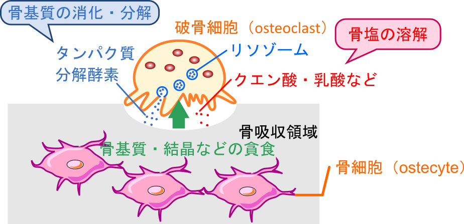 一方で、破骨細胞は骨の「解体業者」として機能します。破骨細胞は骨表面のハイドロキシアパタイトを溶解してカルシウムを遊離させるとともに、コラーゲンや基質物質を分解することで骨を吸収します。