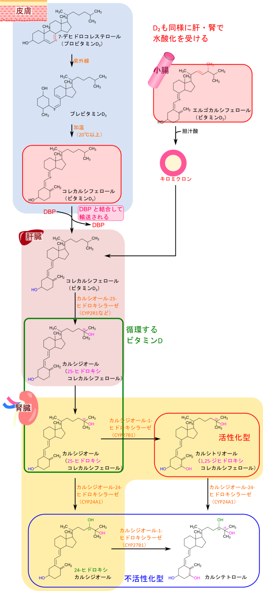 外来性のビタミンDは脂溶性であるため胆汁酸の作用によってミセルを介して吸収されます。吸収されたビタミンDは脂質と同様にキロミクロンに取り込まれて肝臓へ輸送されます。一方で 7-デヒドロコレステロールは皮膚において紫外線の照射を受けてプレビタミンD3を経てコレカルシフェロールに変換され、ビタミンD結合タンパク質(Vitamin D binding protein; DBP)に結合して肝臓に輸送されます。このように外因性のビタミンDはキロミクロンにより肝臓へ輸送されますが、皮膚で産生された内因性のビタミンはDBPに結合することにより肝臓へ輸送されます。