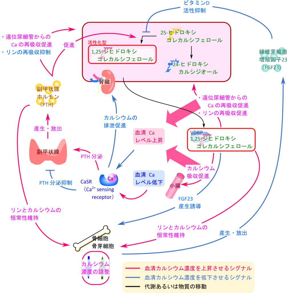 ビタミンDは 25-ヒドロキシコレカルシフェロールとして血中に存在し循環しています。この分子ではビタミンD活性を発揮しませんが、腎臓で水酸化を受けると 1,25-ジヒドロキシコレカルシフェロールへと変換され、ビタミンD活性を発揮するようになります。この活性化はPTHにより促進されます。活性化型となったビタミンDは消化管におけるカルシウム吸収を促進したり、腎臓でのカルシウム再吸収とリン酸の再吸収を誘導して血清カルシウム濃度を上昇させるように作用します。一方、PTHは破骨細胞の分化を誘導して骨吸収を促進するなど骨と血中のリンとカルシウムの恒常性維持に関与します。血清中のカルシウム濃度が上昇するとカルシウム感知受容体(Calcium sensing receptor; CaSR)が Ca2+ と結合して副甲状腺によるPTHの分泌を抑制するように働きかけるとともに腎臓のカルシウム排泄を促します。このようにして上昇した血清カルシウム濃度が上昇しすぎることを防ぎます。一方で血清カルシウム濃度が低い状況下ではCaSRは副甲状腺によるPTHの発現誘導を行い、PTHとビタミンDによるカルシウム濃度調節が誘導されます。PTHと対となるホルモンにFGF23(fibroblast growth factor 23)があります。このホルモンは血清リン濃度が上昇すると発現が誘導されて骨細胞で産生され、消化管でのリンの吸収抑制と腎臓でのリンの再吸収抑制を通して血中リン酸濃度の調節を担っています。また、25-ヒドロキシコレカルシフェロールから1,25-ジヒドロキシコレカルシフェロールへの転換を阻害することでビタミンD活性を抑制しています。この結果 25-ヒドロキシコレカルシフェロールは 24,25-ヒドロキシカルシジオールへ変換され、不活性化型へ変換されてしまいます。このように、ビタミンDはPTHやFGF23 と協調的に機能し、体内のリンとカルシウムのバランスを調節しています。