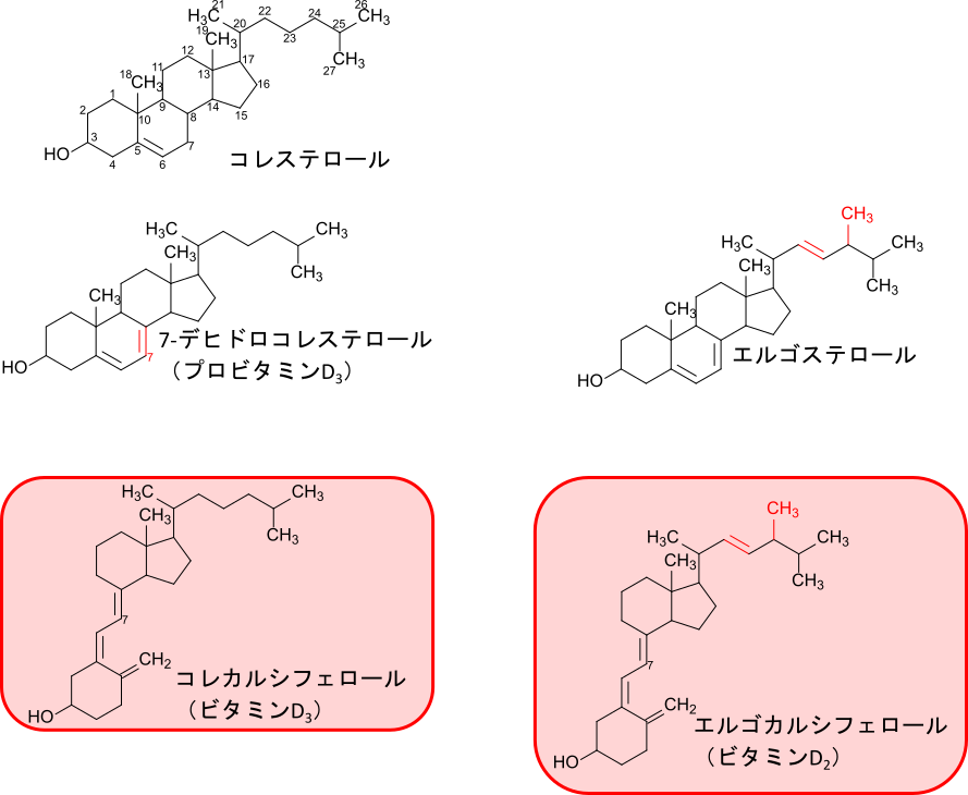 ビタミンDには植物・真菌由来のビタミンD2と動物由来のビタミンD3があります。ビタミンD2の化学名はエルゴカルシフェロールであり、プロビタミンはエルゴステロールです。エルゴカルシフェロールはエルゴステロールが食品中で紫外線照射を受けることにより生成される物質で、ヒトの体内で合成されることはありません。ビタミンD3の化学名はコレカルシフェロールであり、プロビタミンは 7-デヒドロコレステロールです。コレカルシフェロールは 7-デヒドロコレステロールが皮膚において紫外線に暴露されることで生成されます。ビタミンD2は食品中で合成され、エルゴカルシフェロールとして摂取される一方で、ビタミンD3は体内でプロビタミンから変換されることがある点で異なっています(図 1)。