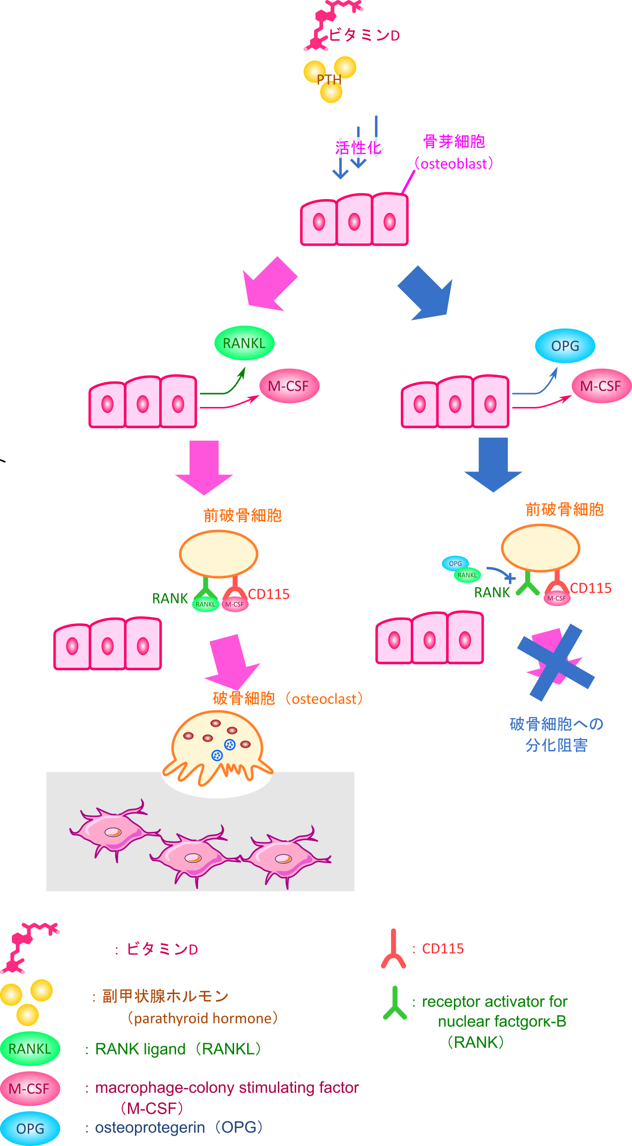 破骨細胞の分化はビタミンDや副甲状腺ホルモン(parathyroid hormone; PTH)によって制御されています。骨芽細胞がビタミンDやPTHの刺激を受けるとRANKリガンド(Receptor Activator for NFκ-B ligand; RANKL)とM-CSF(Macrophage Colony Stimulating Factor)の発現が誘導されます。これらの分子は前破骨細胞上のRANKやCD115に認識されることで前破骨細胞の破骨細胞への分化を誘導します。一方で、骨芽細胞はOPG(Osteoprotegerin)の発現が誘導される場合もあります。OPGは RANK と競合的に RANKL と相互作用することにより RANK と RANKL の結合をブロックして阻害します。この結果、OPGは前破骨細胞の破骨細胞への分化を阻害します。OPGの制御を担っている因子は明らかではありませんが、ビタミンDとPTH は RANKL の発現誘導と OPG の発現抑制によって破骨細胞の成熟を促進すると考えられています。このようにOPG-RANKL バランスは破骨細胞の成熟と骨吸収に重要な役割を担っています(図 6)。