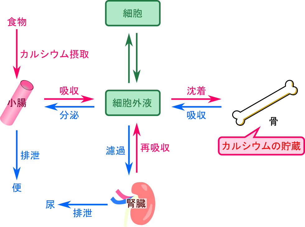 食物中のカルシウムは一部が消化管を通じて吸収されますが、取り込まれなかったカルシウムはそのまま便中に排泄されます。また、消化液や剥がれ落ちた消化管粘膜細胞に含まれるカルシウムも便中に排泄されます。Ca2+ として取り込まれたカルシウムは細胞外液中や細胞内に一定濃度で存在し、骨にも沈着して分布することになります。骨は体内のカルシウムの大部分が分布しており、身体を支えるだけでなくカルシウムの貯蔵装置としての役割も担っています。余分なカルシウムは腎臓で濾過されて尿中に排泄されますが、一部は再吸収されます(図 3)。